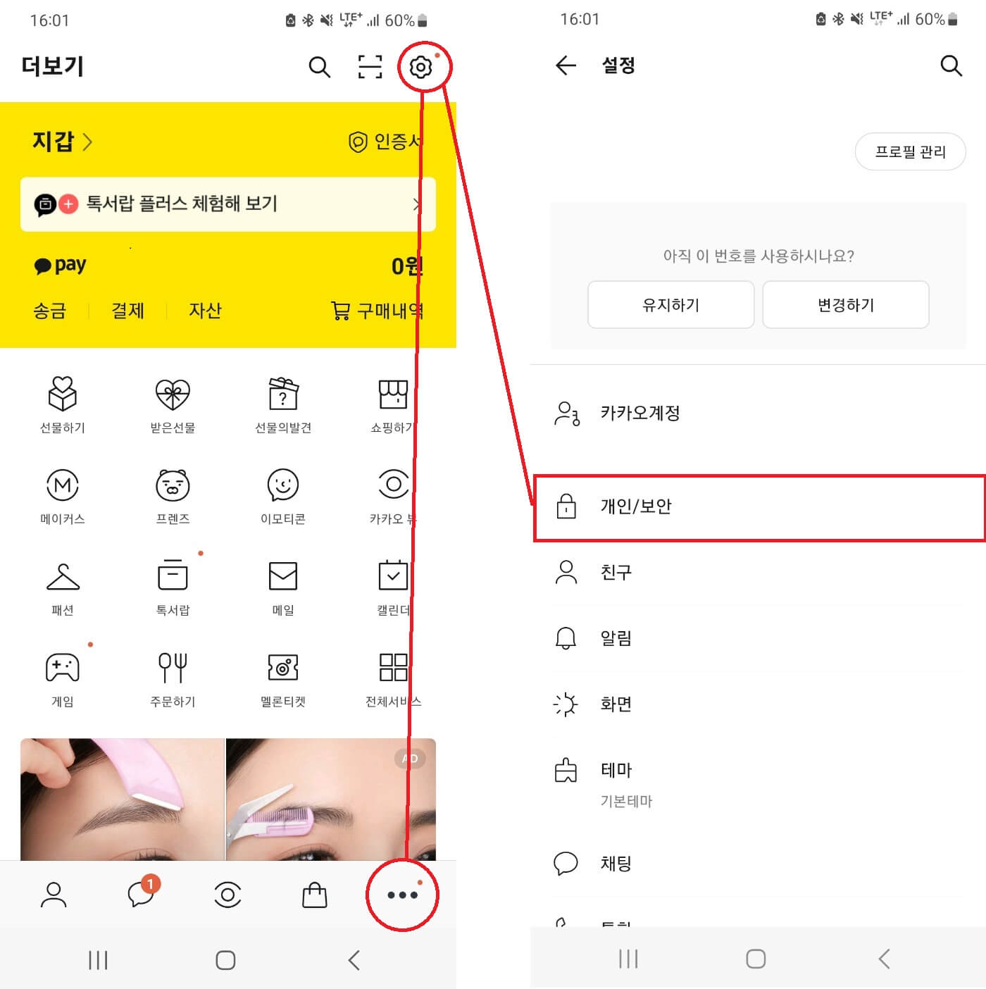 제일 먼저 카카오톡을 실행한다. 그 이후 우측 하단의 점 세개 모양의 메뉴를 눌러준다. 다음에는 [개인/보안] 메뉴를 클릭한다.